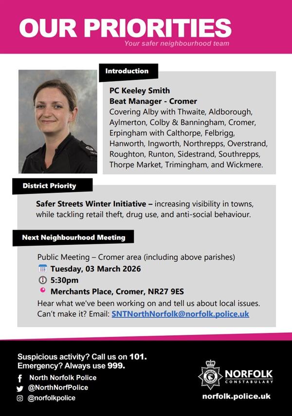 Dear all, Just a quick reminder about our upcoming Neighbourhood Meeting for the Cromer area taking place on: π Tuesday, 03 March 2026 π 5:30pm π Merchants Place, Cromer, NR27 9ES The Cromer Neighbourhood Meeting covers the parishes of Alby with Thwaite, Aldborough, Aylmerton, Colby & Banningham, Cromer, Erpingham with Calthorpe, Felbrigg, Hanworth, Ingworth, Northrepps, Overstrand, Roughton, Runton, Sidestrand, Southrepps, Thorpe Market, Trimingham, and Wickmere. Weβll be sharing updates on recent activity and discussing local issues and concerns. If you're unable to attend but would like to raise a matter, please email your local Beat Managers at SNTNorthNorfolk@norfolk.police.uk. You can also share your views at any time by completing ourNeighbourhood Policing Survey. If youβre able to help spread the word - by displaying the attached posters on a noticeboard, sharing on social media, or including in a newsletter β we would be very grateful. If you have any questions, please contact us via the email above or reach out to me directly. Kind regards Pete | ||