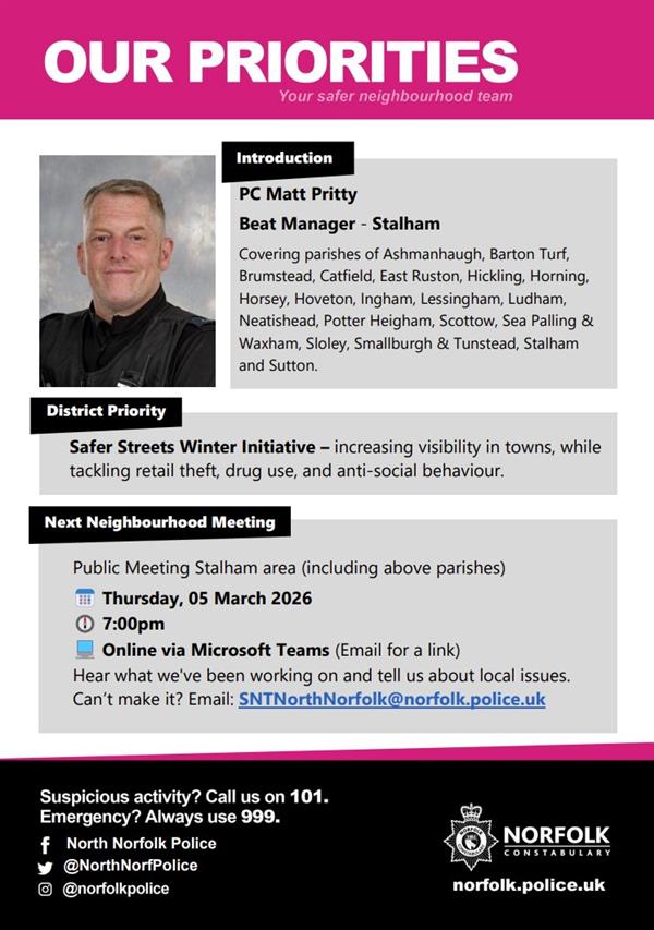 Dear all, Just a quick reminder about our upcoming Neighbourhood Meeting for the Stalham area taking place on: π Thursday, 05 March 2026 π 7:00pm π» Online via MS Teams β (Link: Join the meeting now) The Stalham Neighbourhood Meeting covers the parishes of Ashmanhaugh, Barton Turf, Horning, Brumstead, Catfield, East Ruston, Hickling, Horsey, Hoveton, Ingham, Lessingham, Ludham, Neatishead, Potter Heigham, Sea Palling & Waxham, Scottow, Sloley, Smallburgh, Stalham, Sutton, and Tunstead. Weβll be sharing updates on recent activity and discussing local issues and concerns. If you're unable to attend but would like to raise a matter, please email your local Beat Managers at SNTNorthNorfolk@norfolk.police.uk. You can also share your views at any time by completing ourNeighbourhood Policing Survey. If youβre able to help spread the word - by displaying the attached posters on a noticeboard, sharing on social media, or including in a newsletter β we would be very grateful. If you have any questions, please contact us via the email above or reach out to me directly. Kind regards Pete | ||