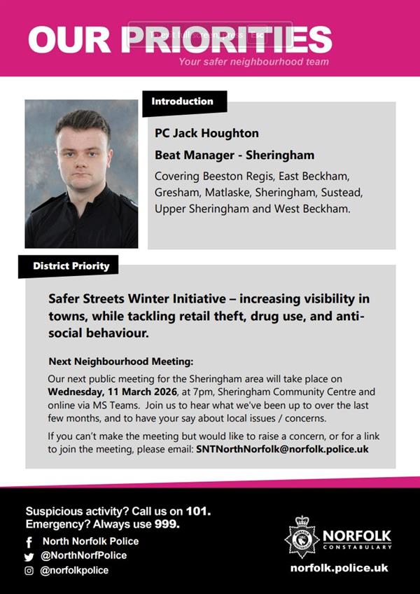 Dear all, Our next Sheringham Neighbourhood Meeting will take place on: ๐ Wednesday, 11 March 2026 ๐ 7:00pm ๐ Sheringham Community Centre and online via MS Teams (please email SNTNorthNorfolk@norfolk.police.uk for link) The Sheringham Neighbourhood Meting covers the parishes of Beeston Regis, East Beckham, Gresham, Matlaske, Sheringham, Sustead, Upper Sheringham and West Beckham. Join us to hear what we've been up to over the last few months, and to have your say about local issues / concerns. If you canโt make the meeting but would like to raise a concern or for a link to join the online meeting, please email: SNTNorthNorfolk@norfolk.police.uk If you can help spread the word by displaying the poster on a noticeboard, sharing it on social media, or including it in a newsletter, weโd be very grateful. If you have any questions, please email the above email address, or feel free to reach out to me directly. Kind regards Pete